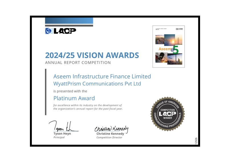We are thrilled to announce that Aseem Infrastructure Finance Limited has been declared as Runner Up under the category ‘Best ESG Initiatives’ by ASSOCHAM in its 19th Annual Summit & Awards on Banking & Financial Sector Lending Companies.